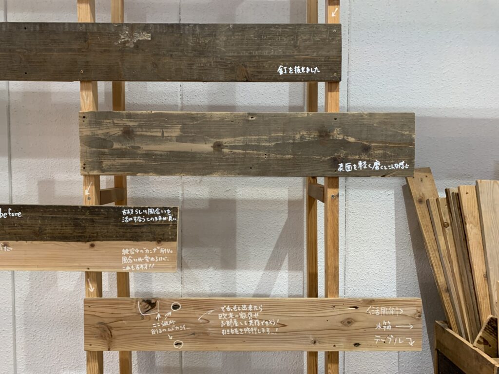 展示では、古民家からレスキューされた床板などの古材が、どのような工程を経て再び活用可能な素材となるのかを紹介しています。
